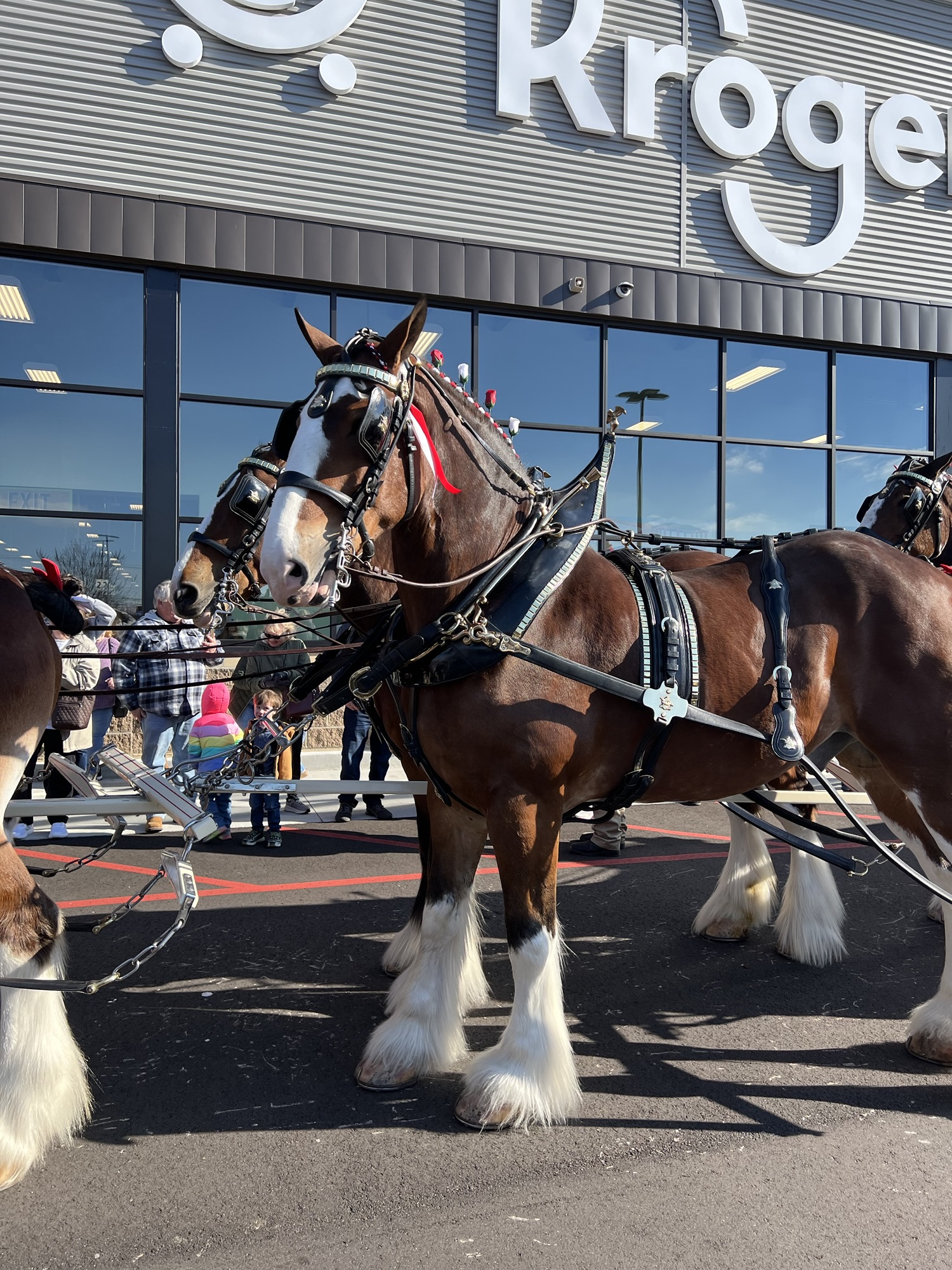 Today we learned that the Budweiser Clydesdales were coming to Arlington, TN with their full team and wagon. Brooklyn and I didn’t waste any time getting there and found we were not even the first 100 people to show up. They were parked at the Kroger parking lot where the crowd had gathered behind strings…